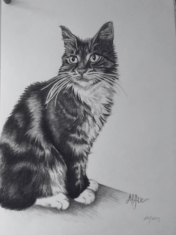 Meet Alfie | A curious, cuddly & handsome boy, part Maine Coon so a large cat. Illustrated using graphite to fit frame size portrait 30cm x 40cm.